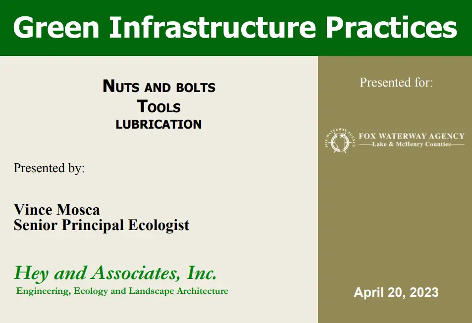 This presentation explains how green infrastructure can help manage stormwater runoff and improve water quality in the Fox River and Chain O’Lakes watershed. It gives various examples of green infrastructures and how by slowing and filtering runoff, they reduce flooding, prevent erosion, and help remove pollutants such as nutrients, sediment, and chemicals before the water reaches lakes and rivers.