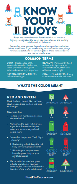 Buoys and channel markers function similar to lanes on a highway—designating the safest navigable channel and marking any hazards on the water. Remember, what you see depends on where you boat—whether inland or offshore. If you are traveling to an unfamiliar area, always review nautical charts for safe navigation. These will note buoys and markers in the area.