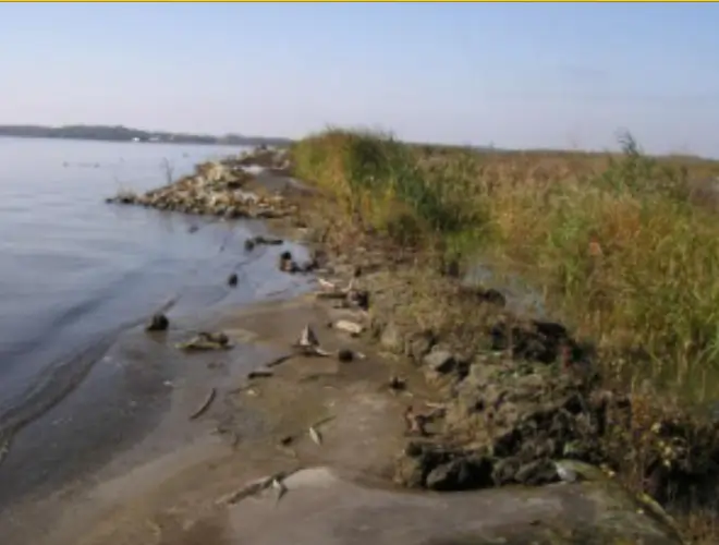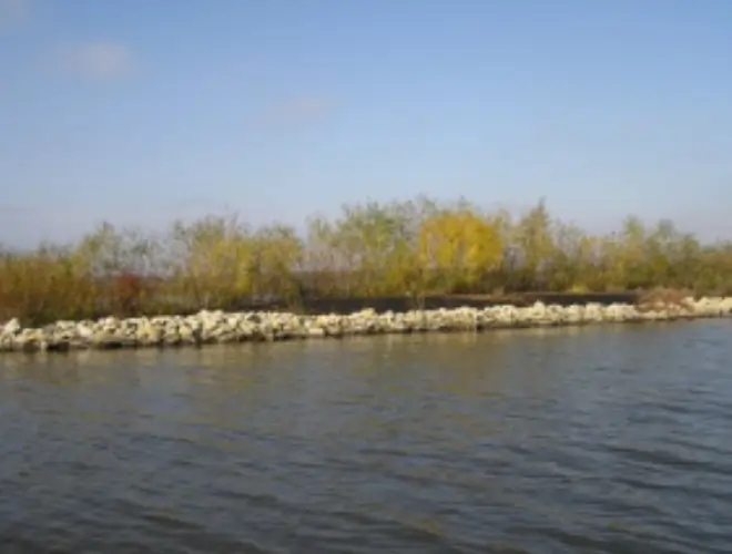 To secure the perimeter, due to damage from human impacts such as snowmobiles, boats and other debris, as well as natural impacts due to ice , wind and wave action, 2005 marked the start of a perimeter protection effort with over — tons of riprap shoreline protection.