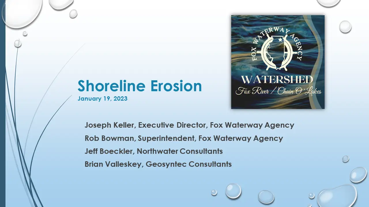 The Shoreline Erosion Presentation (January 19, 2023) discusses the causes, impacts, and potential solutions for shoreline erosion in the Fox River and Chain O’Lakes system. The presentation explains how erosion occurs and how factors such as wave action, boat wakes, fluctuating water levels, and loss of natural vegetation can weaken shorelines and lead to sediment entering the waterway.
